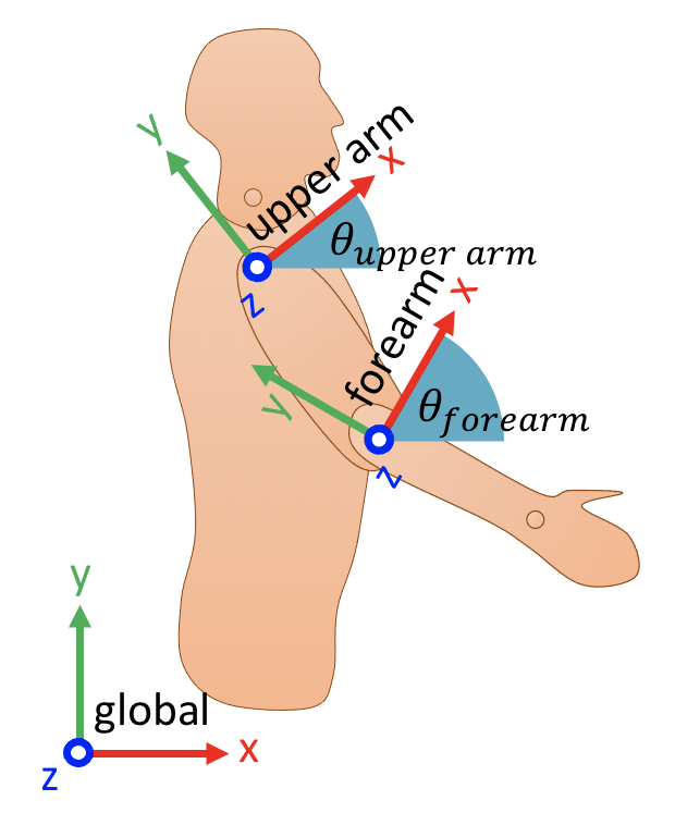 Fig. 9.6 Local coordinates for both the upper arm and the forearm.#