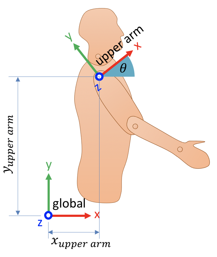 While points and vectors are generally relatively easy to express in a given coordinate system, the orientation of a segment is more complex. For instance, to express the orientation of the upper arm, we explicitly need this information: