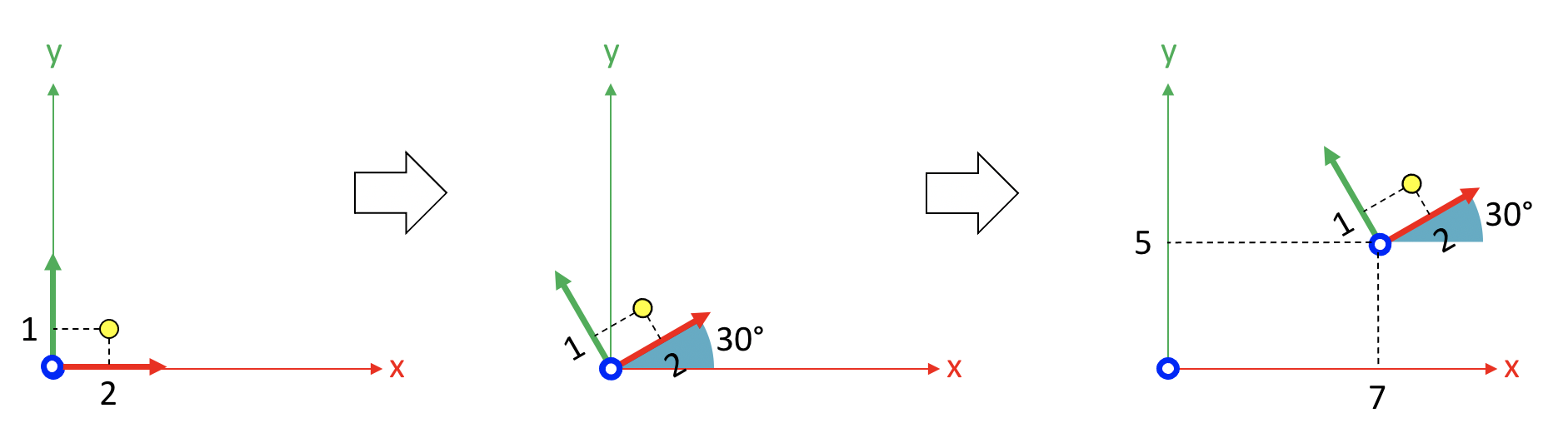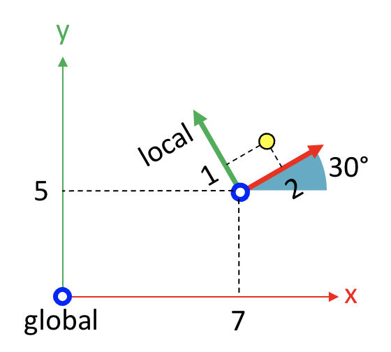 Now, let’s solve the problem. We know the yellow point’s coordinate (2, 1, 0) in respect to the local frame: